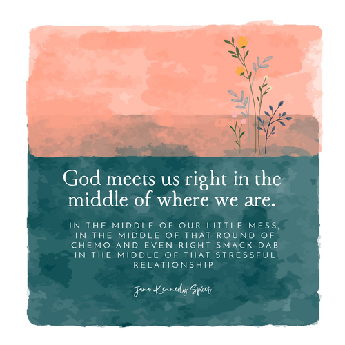 I may not be going to any of those places, but isn’t it wonderful that I don’t have to “go” anywhere to spend time with God – He meets us right in the middle of where we are. In the middle of our little mess, in the middle of that round of chemo and even right smack dab in the middle of that stressful relationship.