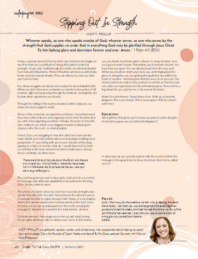 Welcome to The Woven Journal ... 138 full color pages of faith based inspiration. Included are articles, devotionals, Scripture reading lists, recipes, autumn favs, Bible Art Journaling, creative resources and more! This journal focuses on the topics of Strength - Togetherness - Gratitude.