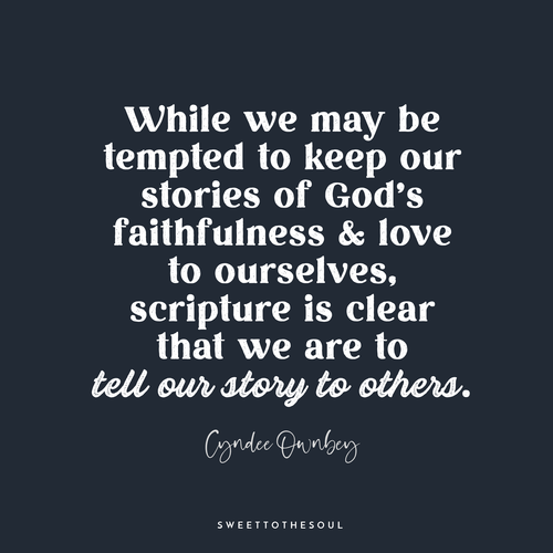 Sharing our stories can inspire other people to look for God’s fingerprints on their current situation and circumstances. While we may be tempted to keep our stories of God’s faithfulness and love to ourselves, scripture is clear that we are to tell our story to others.